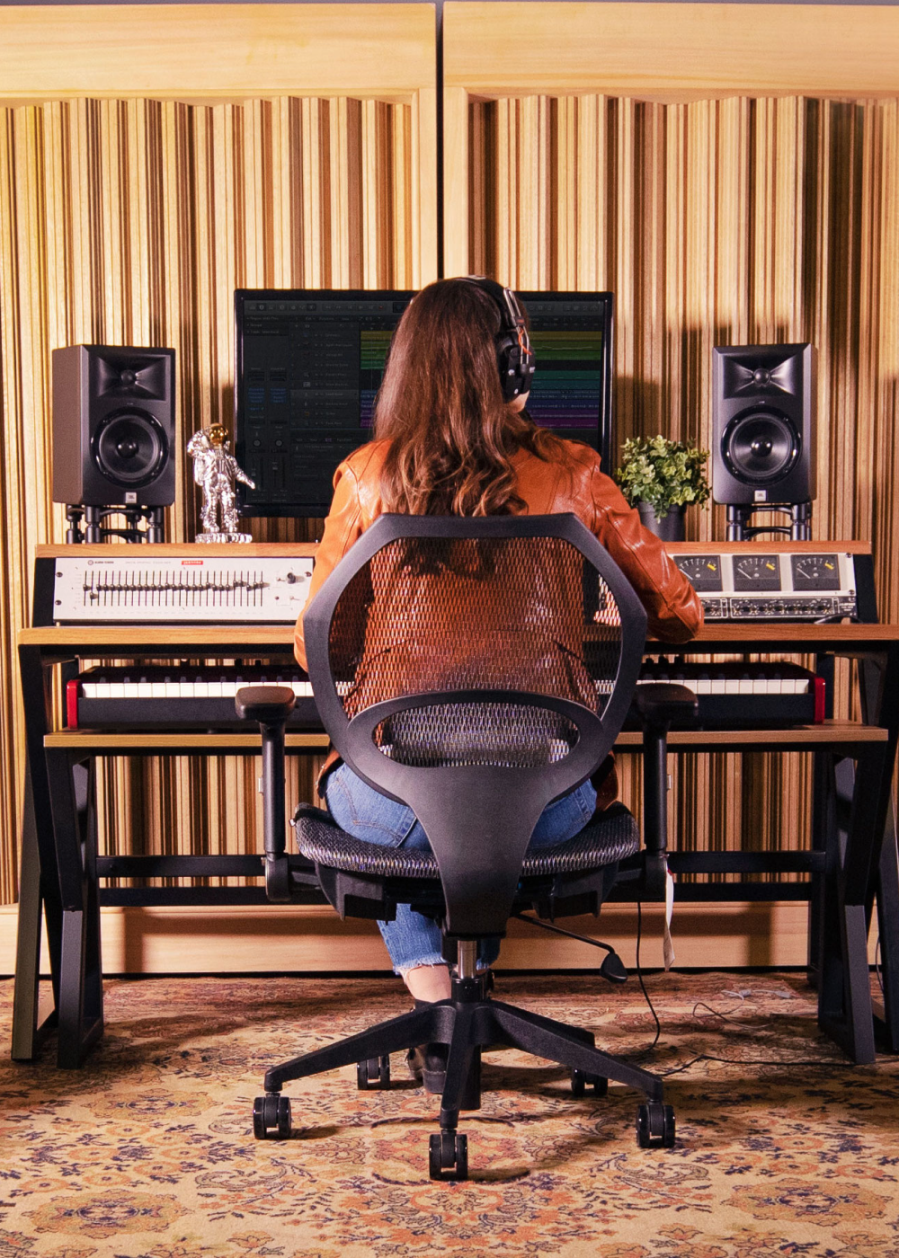 Thoughtful storage space is designed behind Voyager II ™ for musicians to store everything they need during the creation, such as music sheets, capos, or cables. The 3D rotatable armrest can be supportive during the recording engineer and spin backward to create a large space to perform.